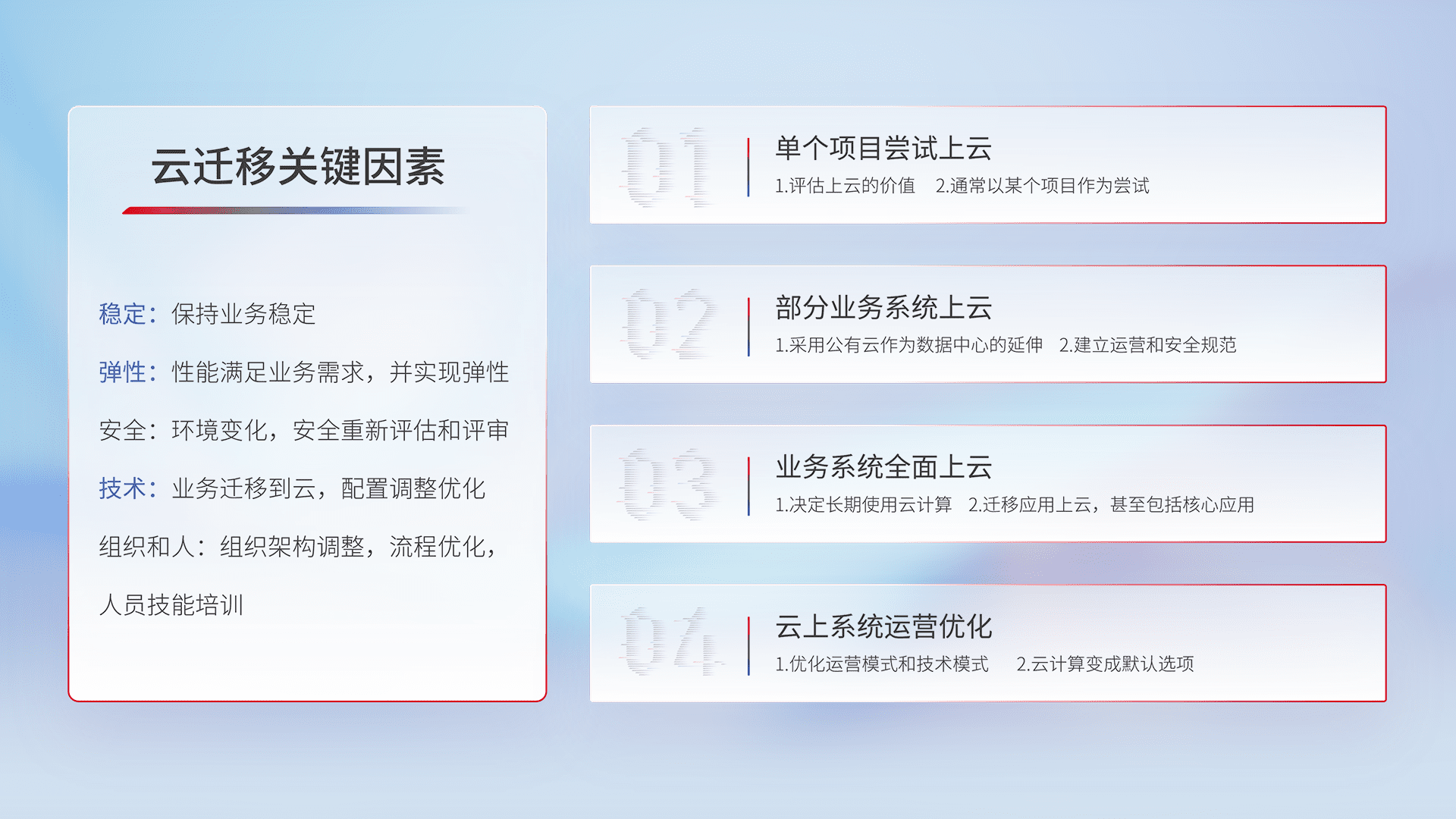 结合实际业务,,,从规划设计、、云平台选型、、、云原生改造、、数据迁移、、、、集成交付,,,,迁移全过程为客户识别最佳上云路径,,,做好风险识别管理,,,,设计网络架构、、、身份权限、、安全审计合规、、、、操作审计、、、日志审计、、监控告警策略、、、多站点容灾设计等,,,,对云上基础设施进行整体规划,,提升IT治理水平,,,以满足弹性、、高可用、、高性能的需求。。。