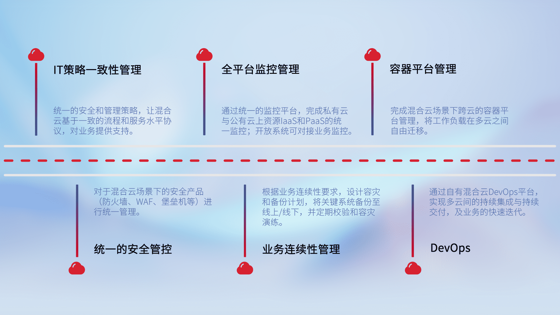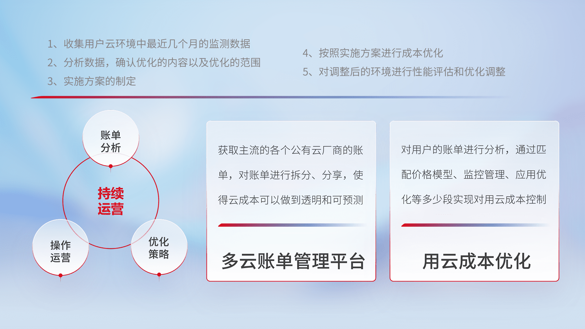 通过多云纳管,,以统一的资源数据模型把客户的云资源进行抽象和封装,,,,进而实现对多云资源的统一操作,,,,保障云资源管理的可靠性、、、稳定性与可用性。。。。量身定制化运维内容,,,配置、、、开发运维、、、补丁管理、、备份、、、、监控、、认证和访问管理、、、审计和日常巡检等,,,,保障在用云过程中的可靠度,,,,稳定度以及高可用率。。