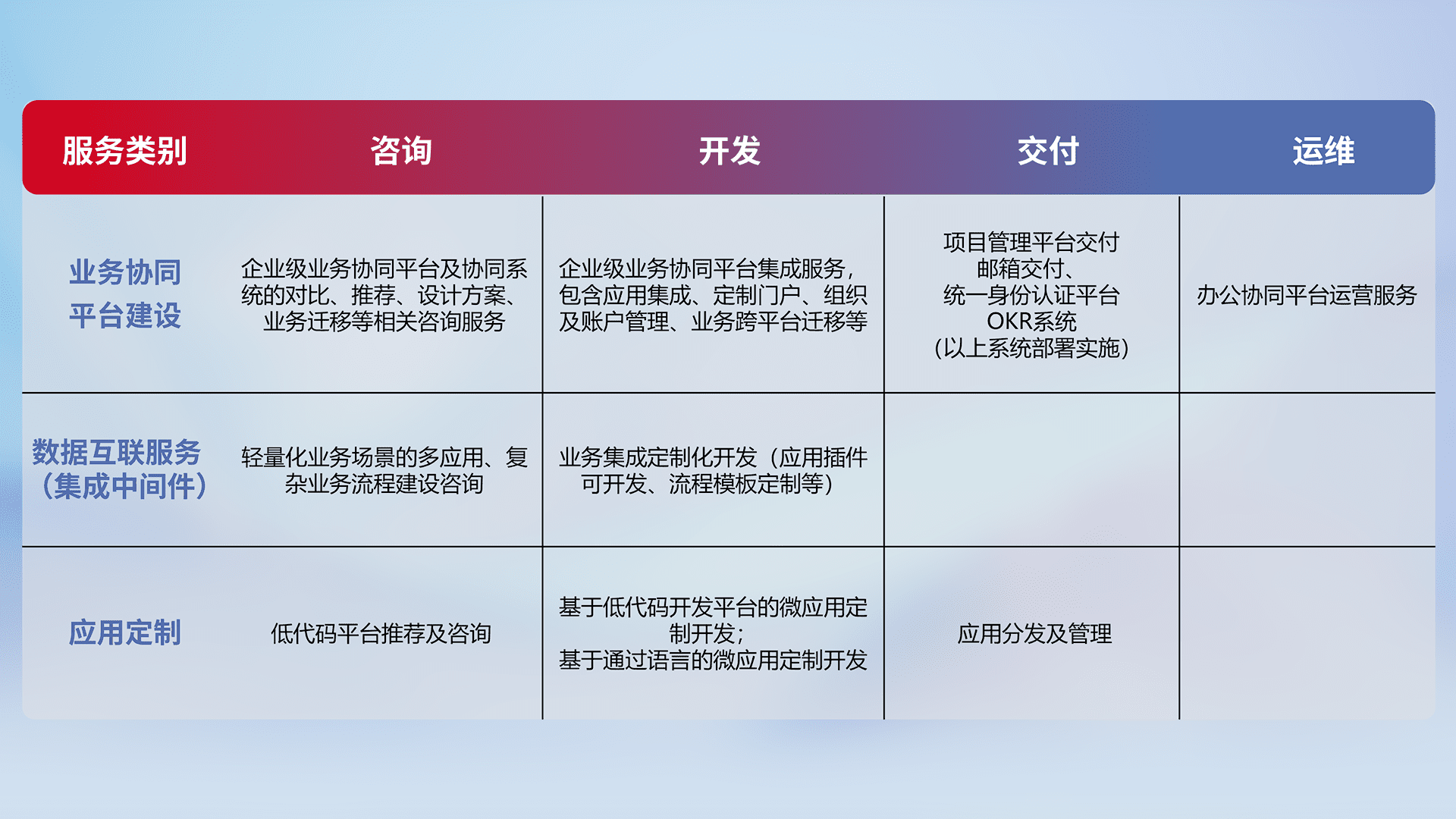针对钉钉、、企微、、、、IDaas等平台级产品提供产品的规划、、方案、、、交付、、、、定制化开发等服务,,,,实现如统一协同办公、、、、智能客户服务、、、、混合会议管理、、、、智能数据查询、、、、等业务场景,,实现数字化转型。。。。
